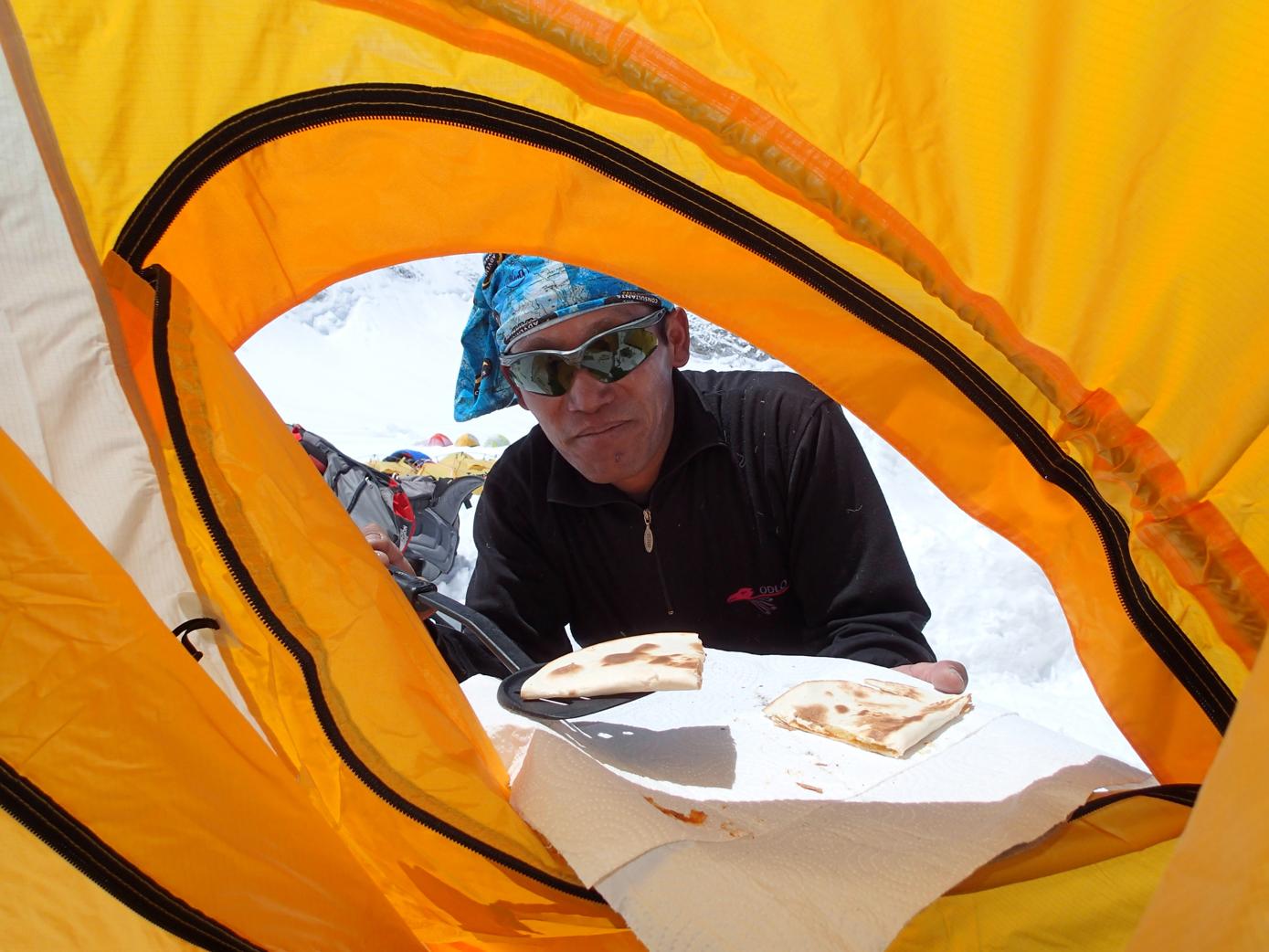 Camp 1 is a very simple camp where we only had our 2-share tents and a small temporary kitchen tent. Our Sherpas managed to cook us astonishingly good food despite these simple facilities, including fresh pizza-like bread. Camp 1 was extremely HOT during the day – and extremely COLD during the evening/night!